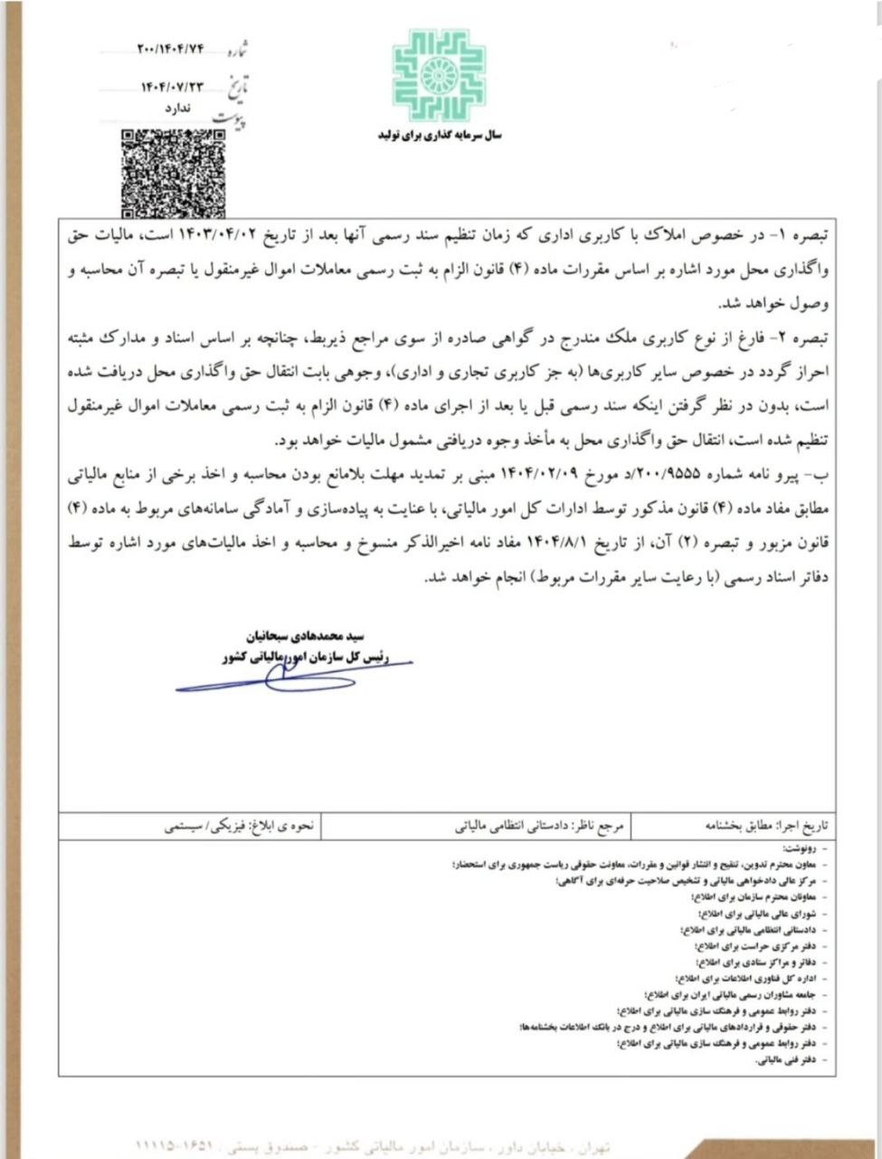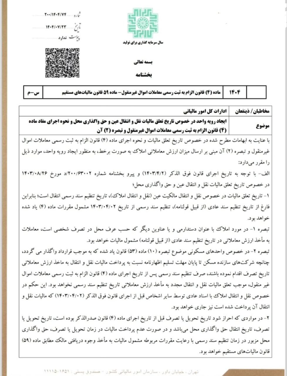 ب- پیرو نامه شماره ۲۰۰/۹۵۵۵/د مورخ ۱۴۰۴/۰۲/۰۹ مبنی بر تمدید مهلت بلامانع بودن محاسبه و اخذ برخی از منابع مالیاتی مطابق مفاد ماده (۴) قانون مذکور توسط ادارات کل امور مالیاتی، با عنایت به پیاده سازی و آمادگی سامانه های مربوط به ماده (۴) قانون مزبور و تبصره (۲) آن، از تاریخ ۱۴۰۴/۸/۱ مفاد نامه اخیرالذکر منسوخ و محاسبه و اخذ مالیاتهای مورد اشاره توسط دفاتر اسناد رسمی (با رعایت سایر مقررات مربوط) انجام خواهد شد.